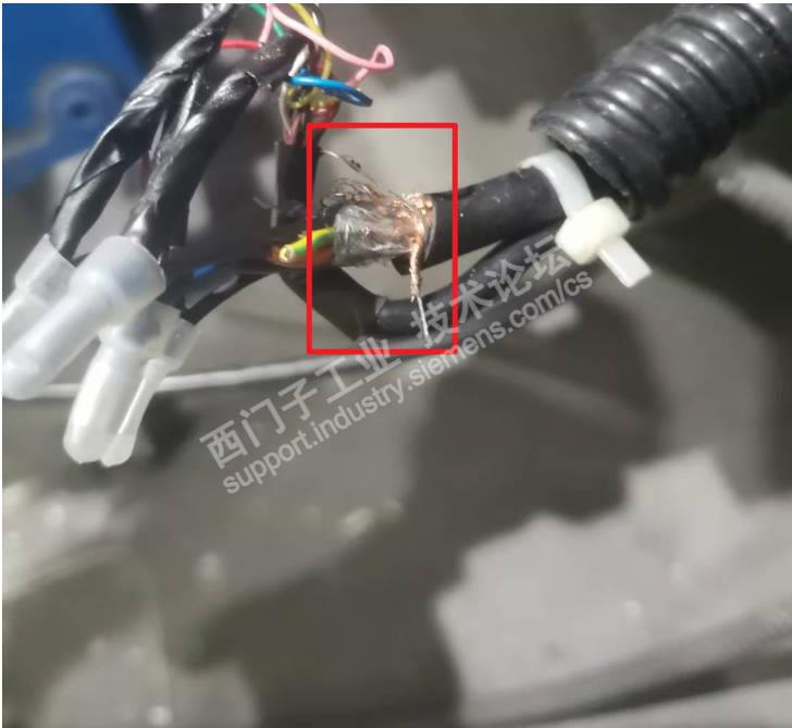 一通与现场的编码器支架对接打孔处理后,新编码器器是安装好了,进入实际的测试,手动启动链运行,看链运行的距离数据在不断上升中,突然链数据停留在某一个值不动了,有情况。检查接线并没有断开,断开编码器的联轴器,手动旋转编码器此时数据没有递增,难道是编码器的本身问题?现场没有什么可以测试的器材,只能放弃新编码器的安装,将原编码器复原回装。在回装过程中脑子一直在想,这个测量是间隙性出现,属于偶发性问题,是否是电磁干扰有关?该设备运行已经有2年,最近也没有大型的设备添加安装,重新接线再检查,发现原来编码器的外层金属屏蔽层并没有连接,图示: