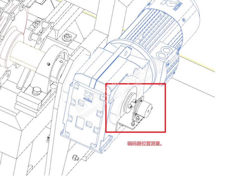 我接到维修信息,到现场观察,明显发现链在运行过程中没有减速定位的过程,难道是那个工作参数没有设置正确或者无意错误设置工作参数造成工作异常?返回办公室拿来笔记本在线监控,发现该链确实没有减速运行的时间,链在高速运行数据还没有到达减速位置时,全程的数据基本已经到了,相当于减速距离没有足够工作空间。再监控该设备的另外一根链条的运行,大概有3S左右时间的减速过程。基本同样的控制程序,这么会造成这个结果?编码器前几天支架断裂过,同事已经应急修理过,驱动链变速器与编码器的连接部位,不可能存在滑动现象了的,图示:编码器与链驱动的连接方式。
