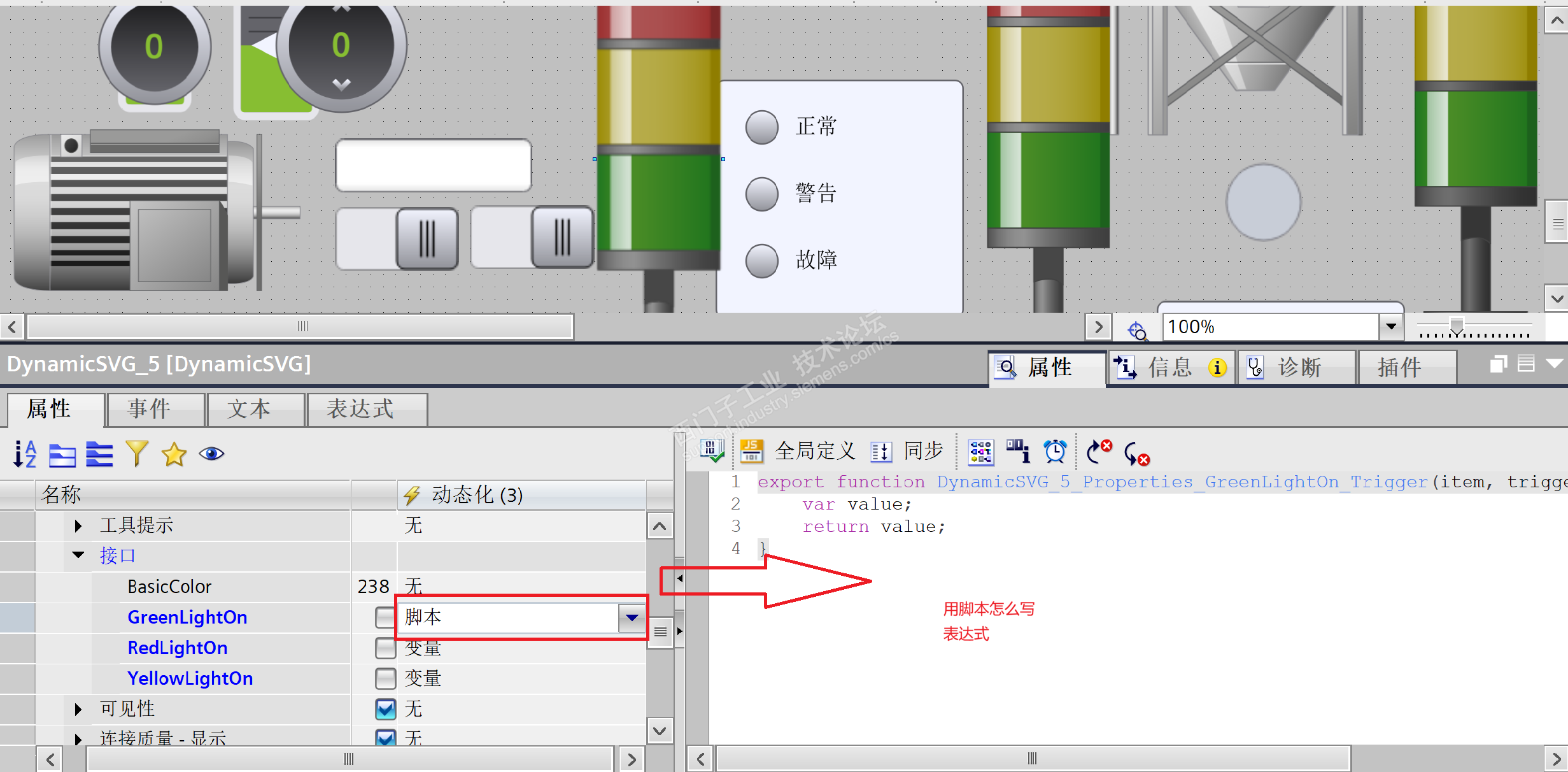 西门子老师您好,请问在wincc unified中,对象接口GreenLightOn中,如果用javascript脚本表达式该怎么写