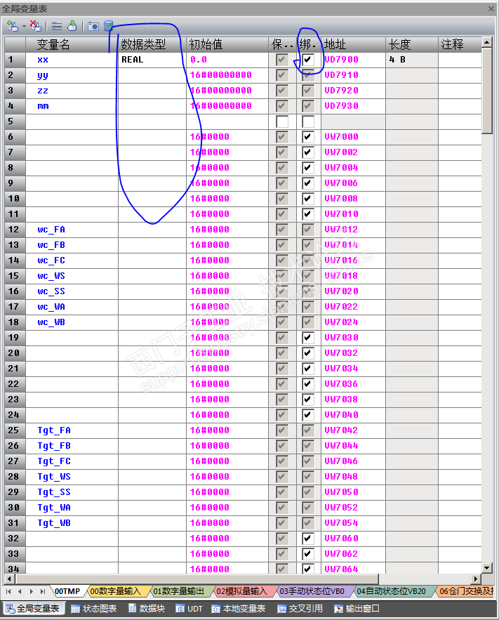 就是以前的符号表,必须选择【数据类型】,然后取消【绑定】那个勾,那么这个变量就变成了与地址无关的全局变量。