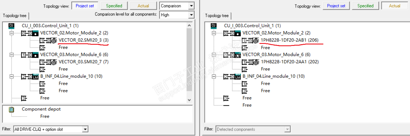 D425:6AU1425-0AA00-0AA0的X100口和X101口连整流单元6SL3353-1AE34-2DA1逆变模块6SL3352-1AE35-0AA1的X400,逆变模块的X401口连西门子的1PH8 228-1DF202AA1-Z电机。这是旧设备,用scout连接D425,在线automatic configuration配置后上传组态,发现可以在线找到整流逆变单元,但组态topology tree里左边和右边的名字不一样,一个是vector_02.SMI20_3,一个是1PH8228-1DF20-2AA1。打开组态的VECTOR_02里的configuration,在VECTOR_02.Motor_SMI_5 (Motor)的order no里的型号是1PH8228-1DF2x-xxxx,和右边一样一样,但topology里名称不一样。请问上传上来的组态这样是拓扑配置与实际连接的不一致吗?