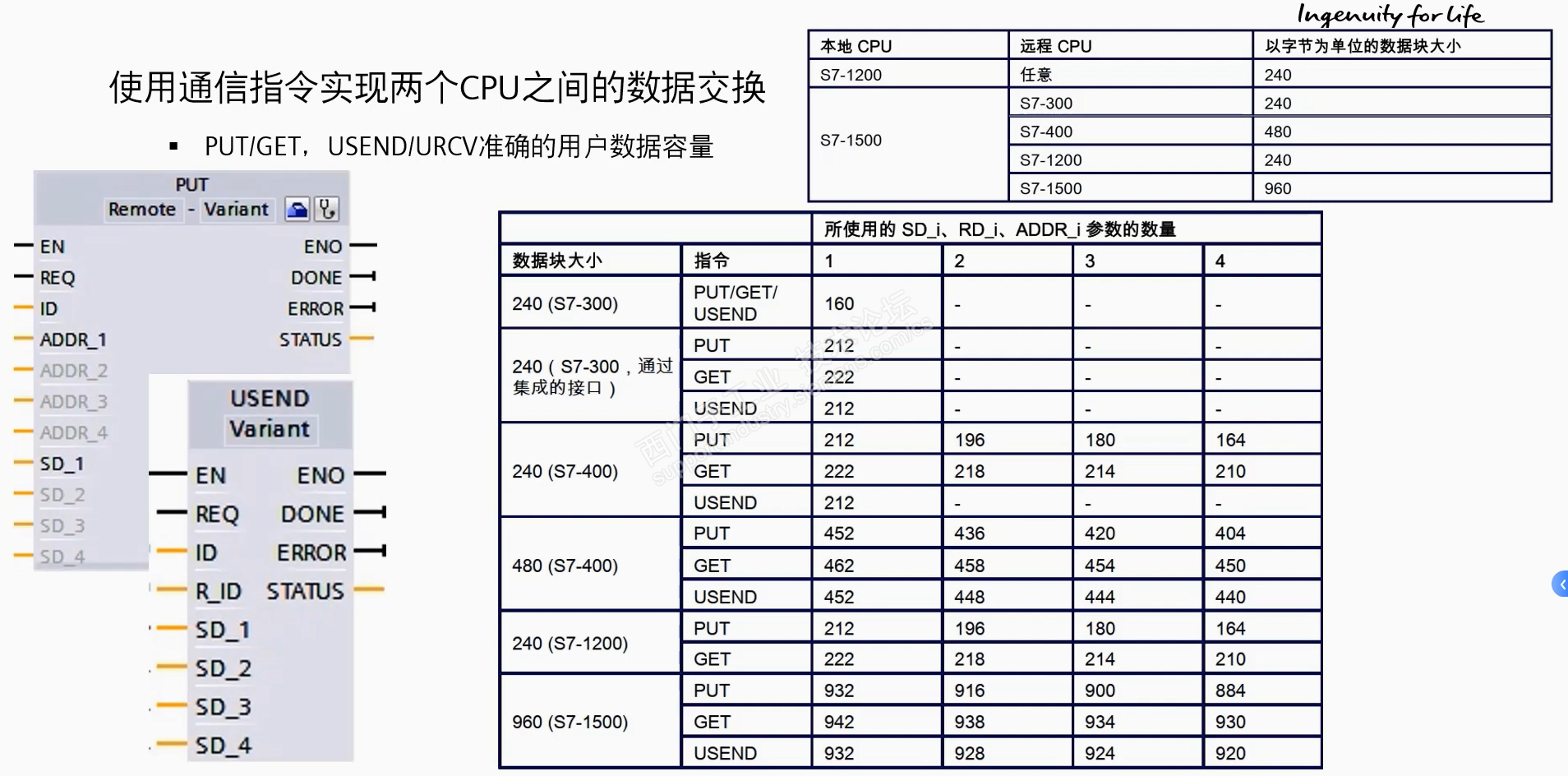 S7 put get指令一次传输的最大数据量以及每个管脚所能连接的数据量大小因CPU型号不同而不同 已双方plc中所能传输的数据量最小的那个为准