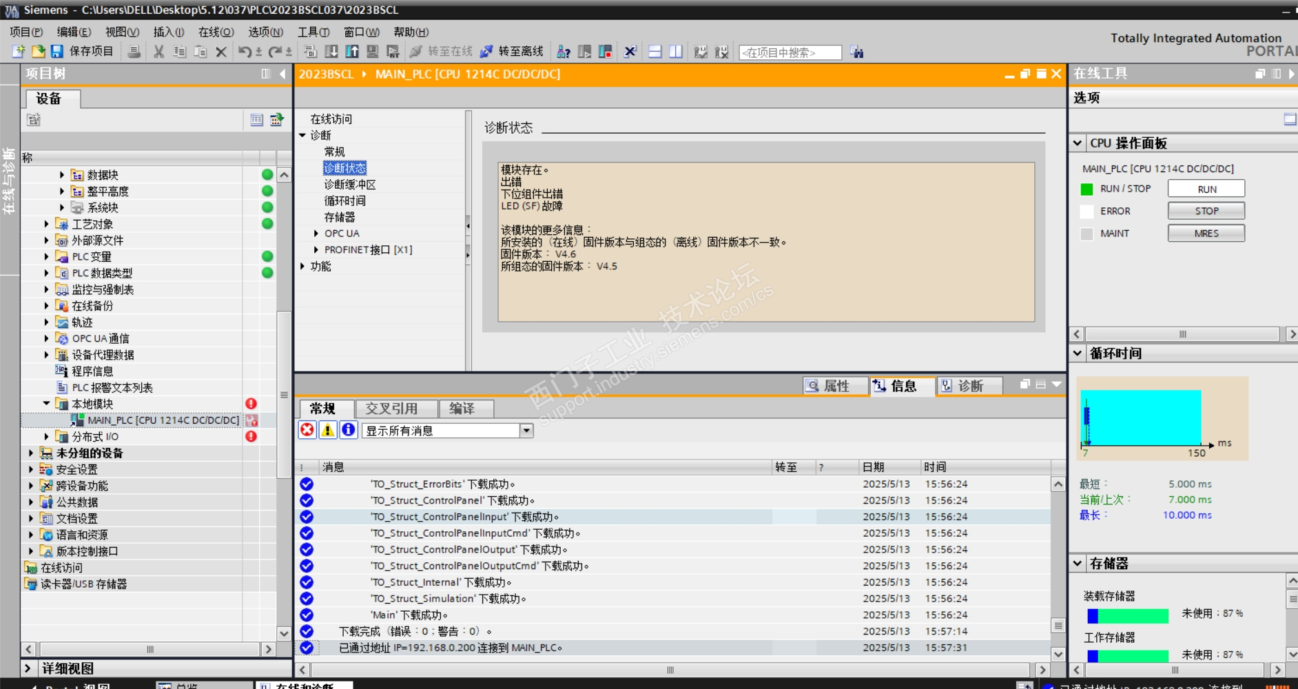 CPU实物是 V4.6的,编程组态是V4.5的这个差异也不会造成 SF灯亮的,得查看其他诊断信息