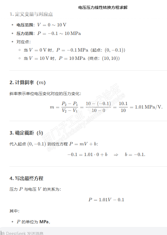 听你的意识,应该是找出他的线性关系就可以通过电压知道压力的值,而不用代入西门子那两个指令来计算,我觉得你说的有道理,知道线性关系方程式,就可以知道仪表的实时压力的,你看我deepseek的东西,这样可以吗,谢谢啊