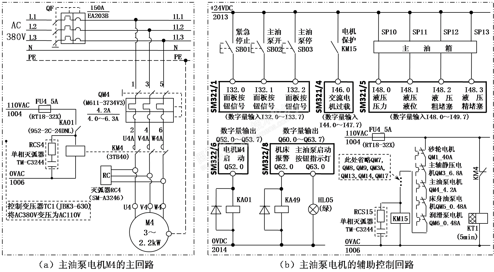 在确认所有电气连接正确无误和电控柜内配电板上所有自动开关均在“通”位置上及所有熔断器完整完好的前提下合上电源总开关QF(150A)将3相AC380V电源引入机床SINUMERIK 810D系统启动且控制面板上的所有指示灯点亮5秒钟NCK通过接口DB10.DBX104.7和DB10.DBX108.7向S7-300PLC(CPU315-2DP)分别传送NCK-CPU就绪信号和NC就绪信号辅助线圈M0.0通电以用于PLC的后续逻辑处理按下控制面板上[主油泵开]绿色带灯按钮SB02(AR22FOP-10E3G)时S7-300PLC的输入信号I32.1接通依次经过主油泵开辅助线圈M25.0和主油泵运行辅助线圈M70.0的媒介逻辑处理后Q52.0线圈通电保持并向机床侧输出信号中间继电器KA01线圈(DC24V)得电其常开触点闭合接触器KM4线圈(AC110V)得电其主触点闭合主油泵电动机M4接通3相AC380V电源而旋转并带动变量叶片泵一同运转以重复吸油和压油过程伴随着M70.0的通电保持[主油泵开]按钮的指示灯辅助线圈M70.7被赋值为1状态Q63.0线圈通电保持并向机床侧输出信号控制面板上[主油泵开]按钮SB02的指示灯点亮呈绿色当按下[主油泵停]红色按钮SB03(AR22FOY-11R)或[紧急停止]红色蘑菇头按钮SB01(A22V2R-01R)时S7-300PLC的输入信号I32.2和I32.0将分别对应接通并使主油泵停辅助线圈M25.1和紧急停止辅助线圈M2.1对应赋值为1状态以用于后续逻辑处理处于通电保持状态的M70.0和M70.7被赋值为0状态(失电)相应的Q52.0和Q63.0被赋值为0状态而停止向机床侧输出信号KA01线圈断电使其处于闭合状态的常开触点呈断开状态且按钮SB02的绿色指示灯HL05熄灭AC110V电源停止向KM1线圈供应使其处于闭合状态的主触点断开主油泵电动机M4停止旋转机床的液压系统停止工作。