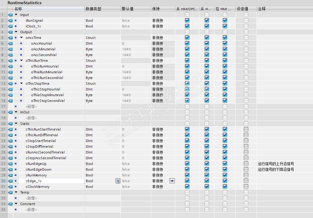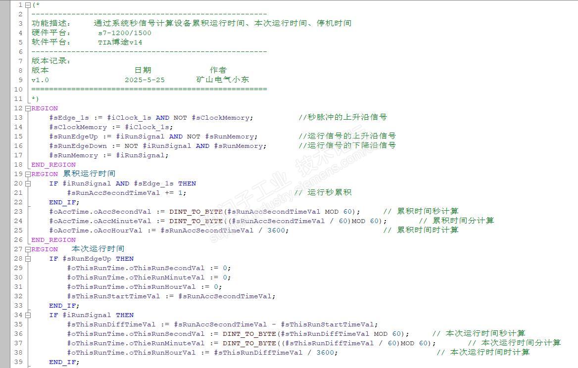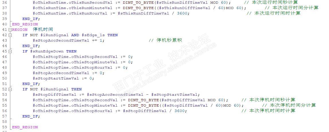 分享一个设备运行时间是设备维护的重要参数,在日常维护中需要对设备运行时间有一个准备精确的掌握,以便于对设备进行维护。本程序是根据现场设备运行的要求,编写了一个通过系统时间秒信号,运算设备的累积时间、本次运行时间、停机时间。