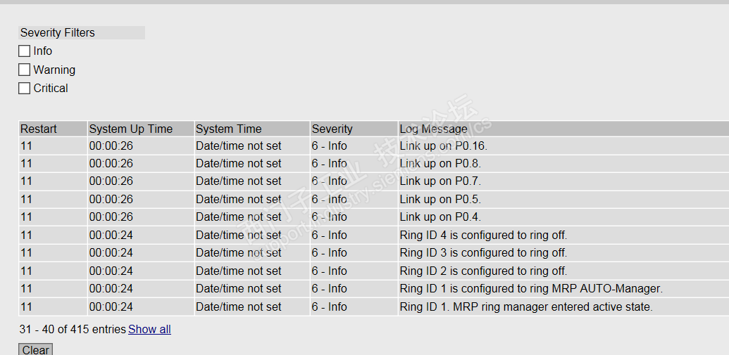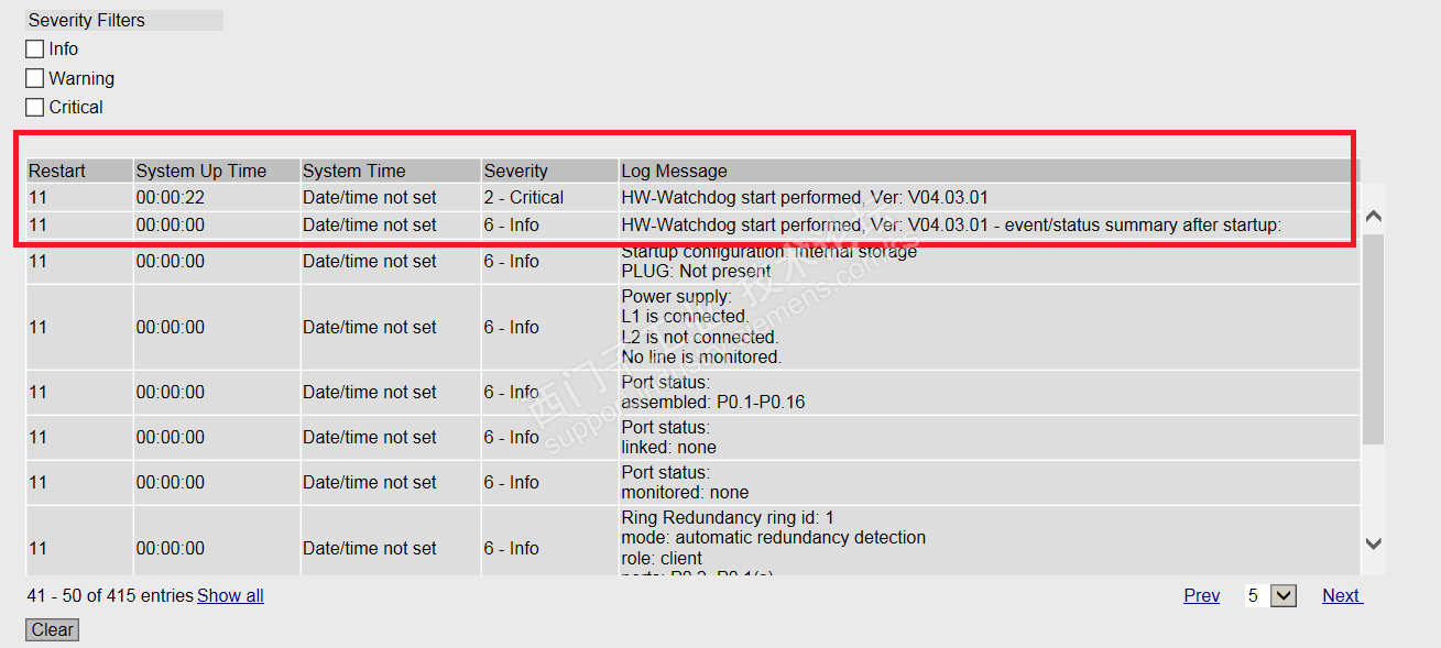 昨天突然出现12个汇川伺服器同时停机现象,伺服器故障诊断为通讯中断,查看S7-1500有通讯中断看门狗超时记录,但没有其他故障信息,而XC交换机日志中有附图信息。到达现场时通讯报警可以复位,网络已自动恢复。
