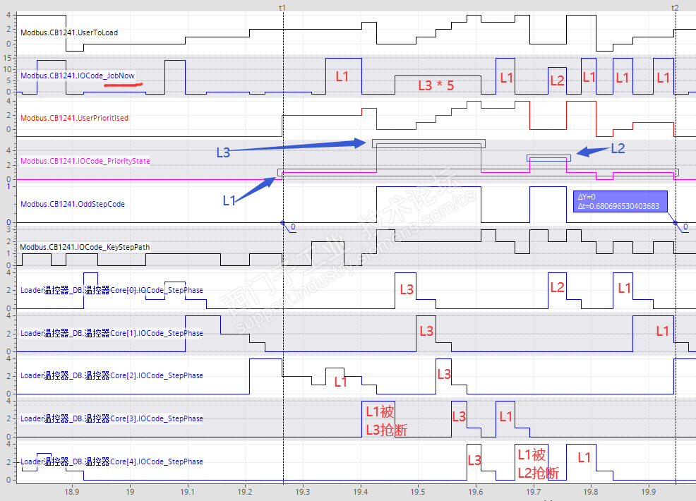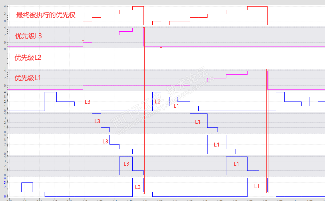另外,第一张图可能会注意到:各个设备的L3任务,在执行的时候,彼此之间是没有间隔一个扫描周期的,虽然分属不同的实例,但紧密相随。其它低等级的任务,彼此之间都有一个扫描周期的间隔。这是规则集合中,离散解耦的规则元素,叠加的效果。