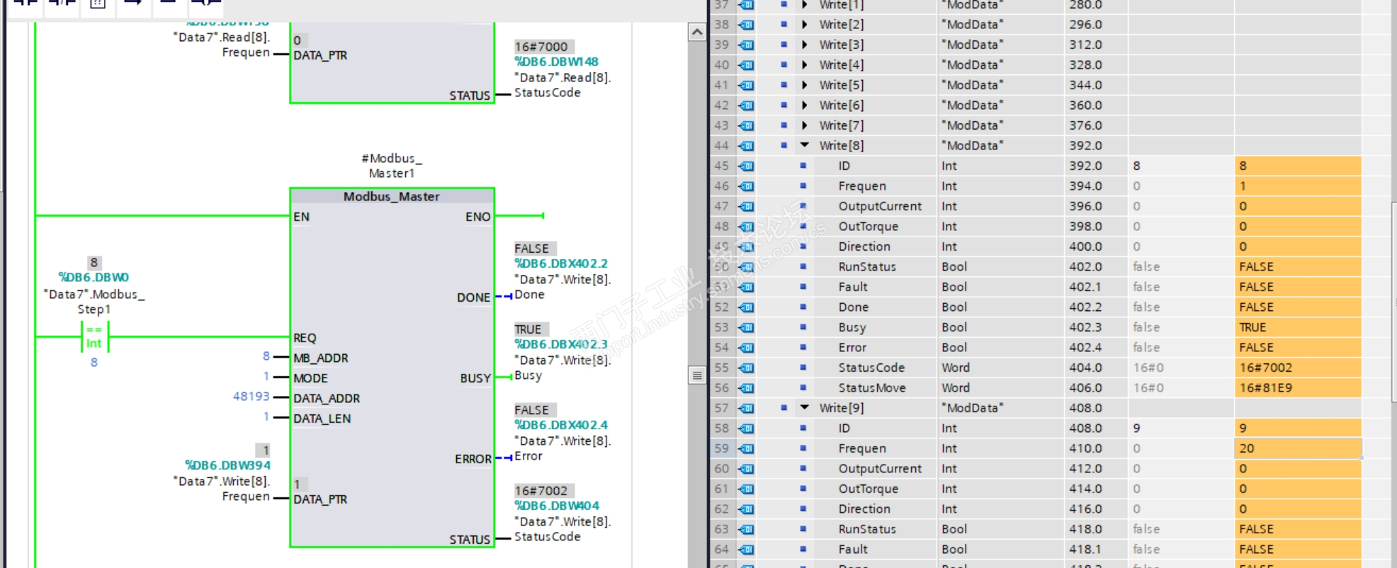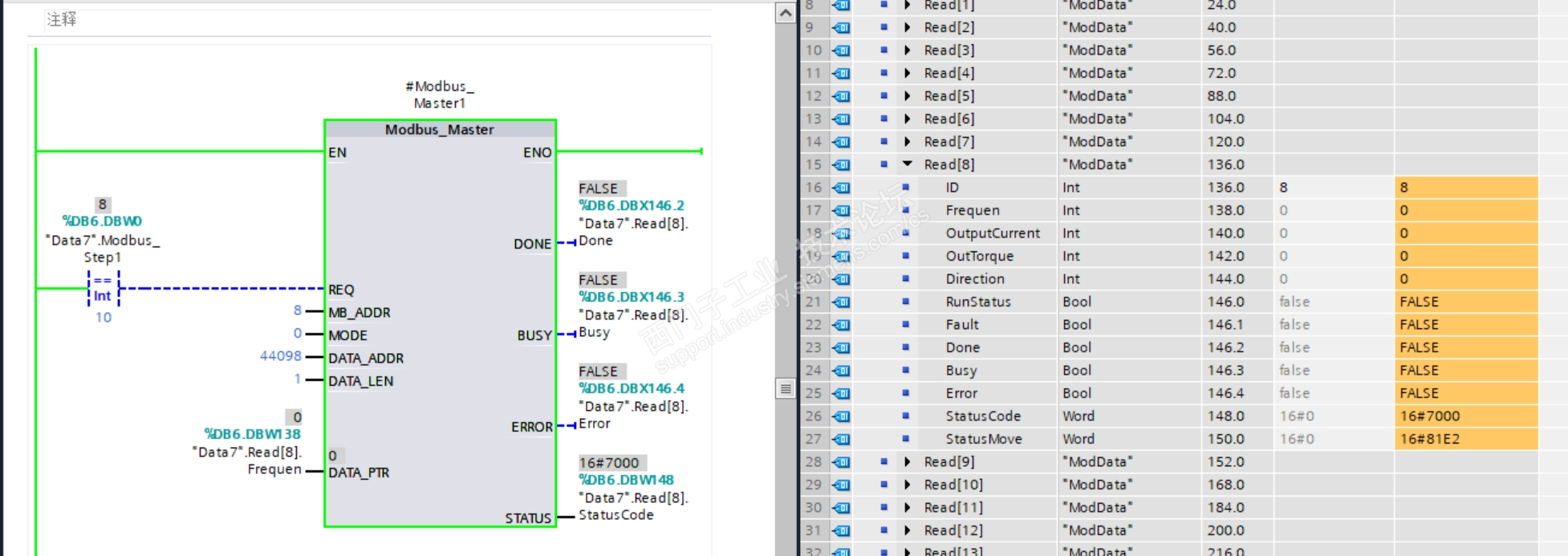 我用的是1215DCDCDC,用CM1241做的串口modbusRTU轮询通信,对方是第三方的变频器 ,背景数据块里的模式改为了4 其余的设置 9600 8 无校验 1位 站号 设置的都没问题 还单独拉了一根485的线接到第三方的变频器上 master指令轮询都没问题,只是master指令一直报错 报错代码 81E2 和81E9 我看了指令说明这两个代码没有说明,这个报错代码是什么问题???? 7000和7002 这两个应该不是报错吧??