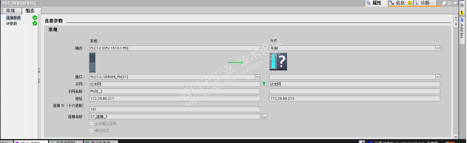 2台1513需要PUT和GET通讯传输数据 再设置PUT和GET参数时 定义伙伴为指定连接时 “连接参数”也没报错 但是GET和PUT程序通讯一直不上 一直报错 状态代码为1 但是IP地址能拼通 ; 如果将伙伴为“未知”时 “连接参数”也没报错 PUT和GET程序通讯正常 但是却不能将对方CPU获取数据过来 也不能将本地数据推送过去 很奇怪这个问题 怎么处理