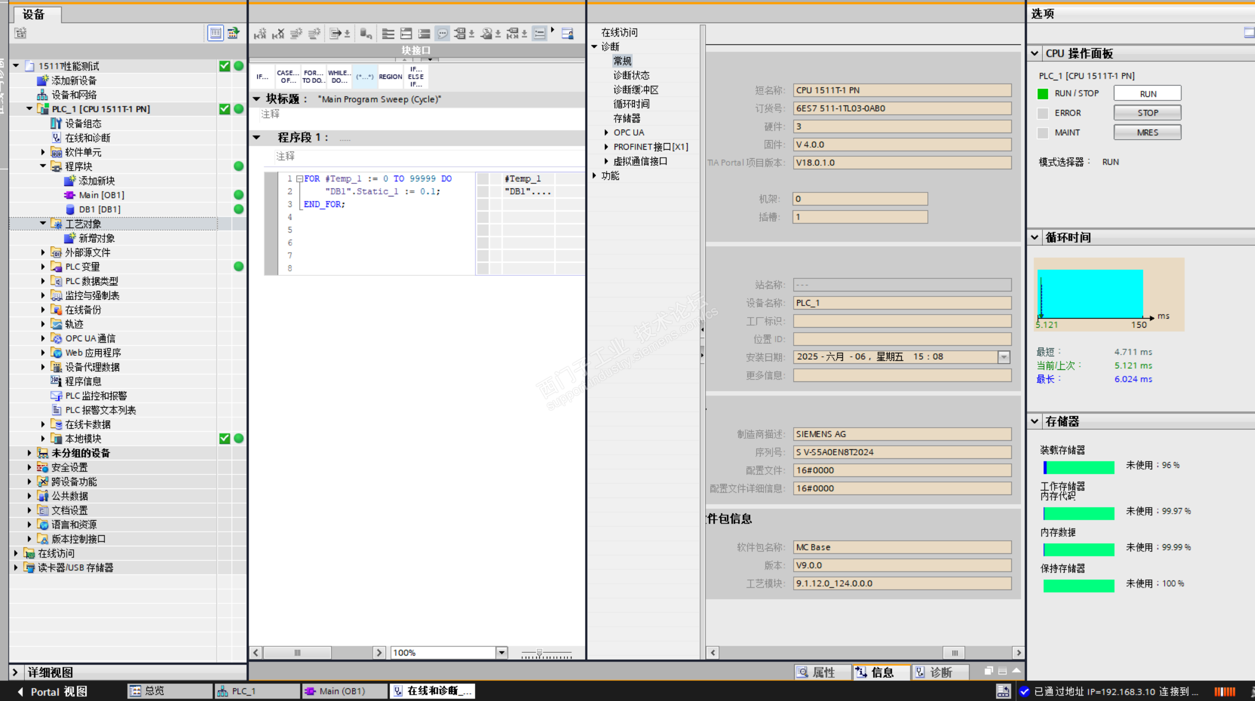 如图所示,两个都是10万次循环变量都是LREAL,除了博途连接无其它负载。