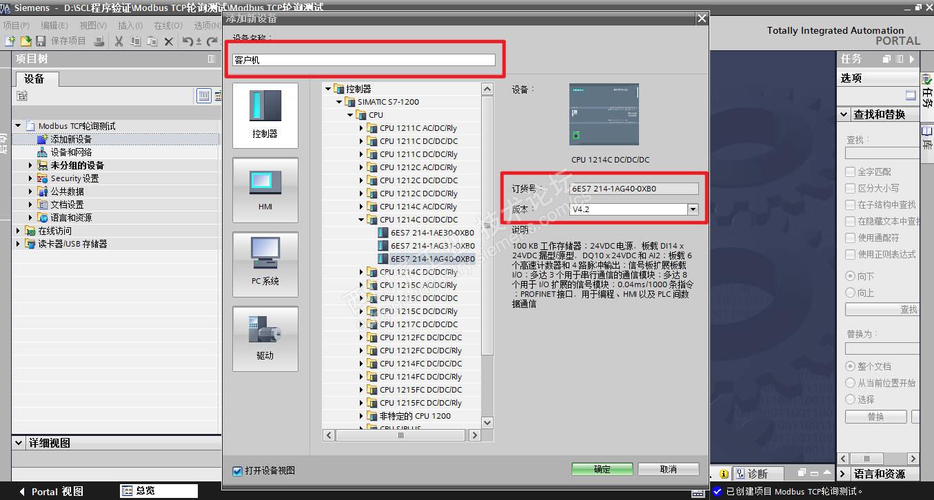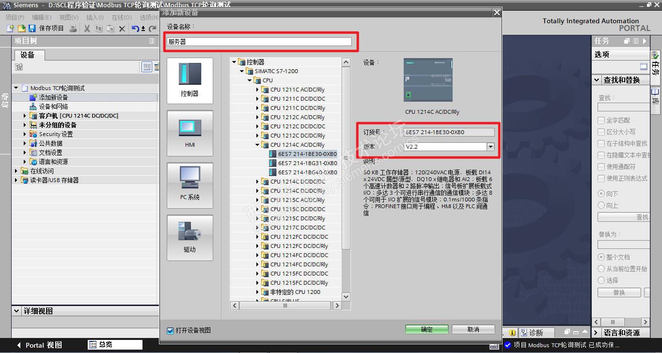 1) 创建一个测试项目,用2个s7-1200的cpu,S7-1214C DC/DC/DC版本V4.2和S7-1214C AC/DC/Relay版本V2.2,其中,V4.2作为客户机,V2.2作为服务器侧进行多任务工作测试,图示1: