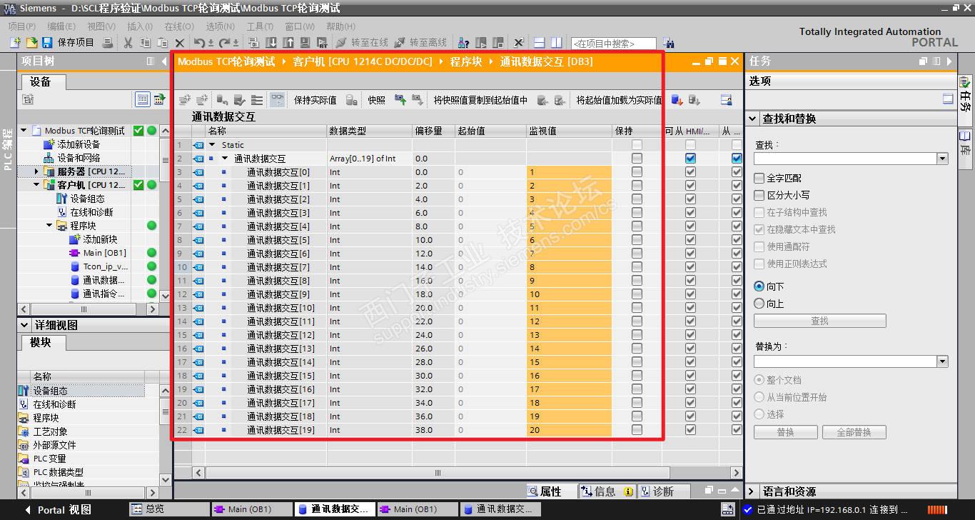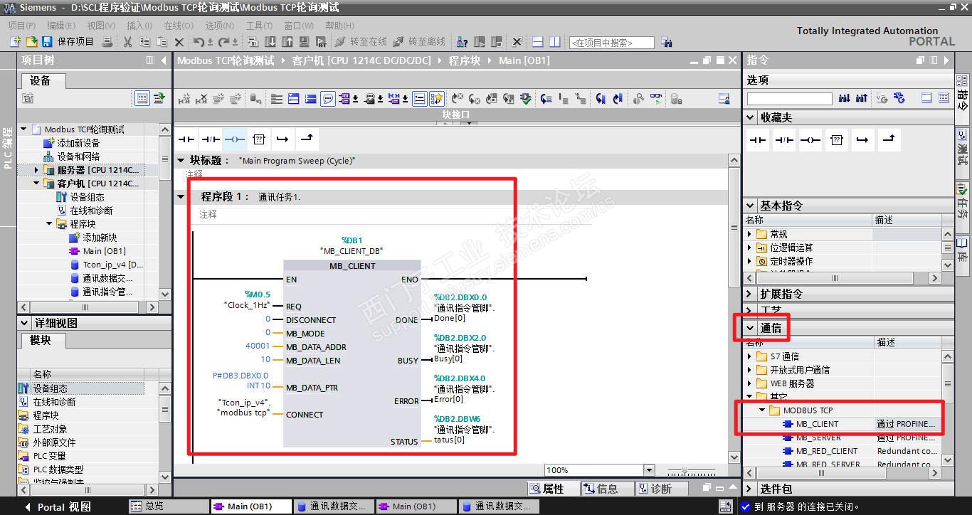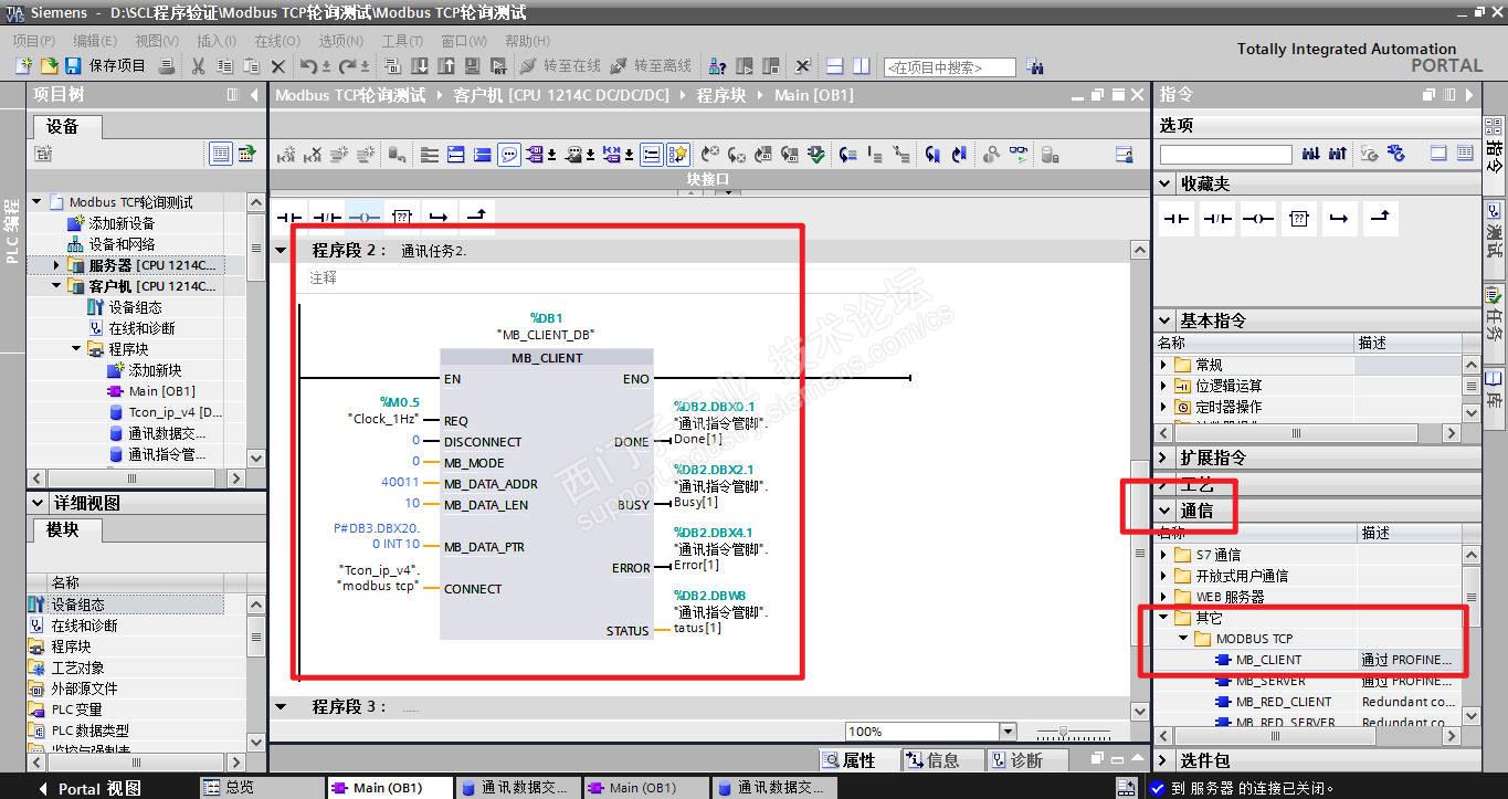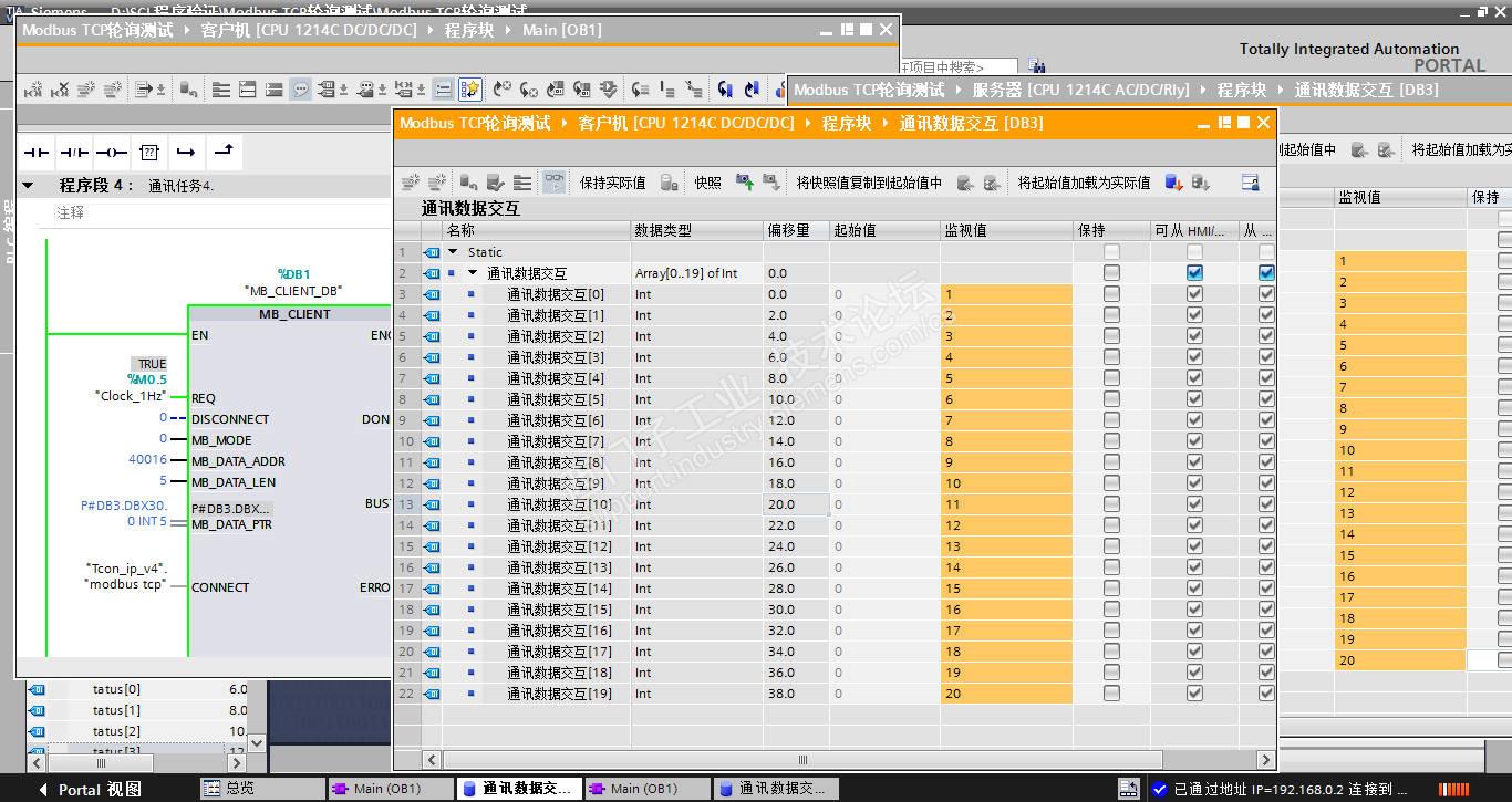 测试环境用Protal版本V15组态的CPU版本V4.2作为客户机,CPU版本V2.2作为服务器,用于Modbus TCP测试客户机多个任务同时触发时,测试项目的4个MB_Client指令同时触发,数据交互仍然能够正常。由此说明,基于以太网硬件网络的modbus通讯无需再如同半双工那样,考虑同时触发调用通讯指令的问题。当然,测试可能存在一定的局限性和片面性,只是说明了一个测试的方向的预判结果。