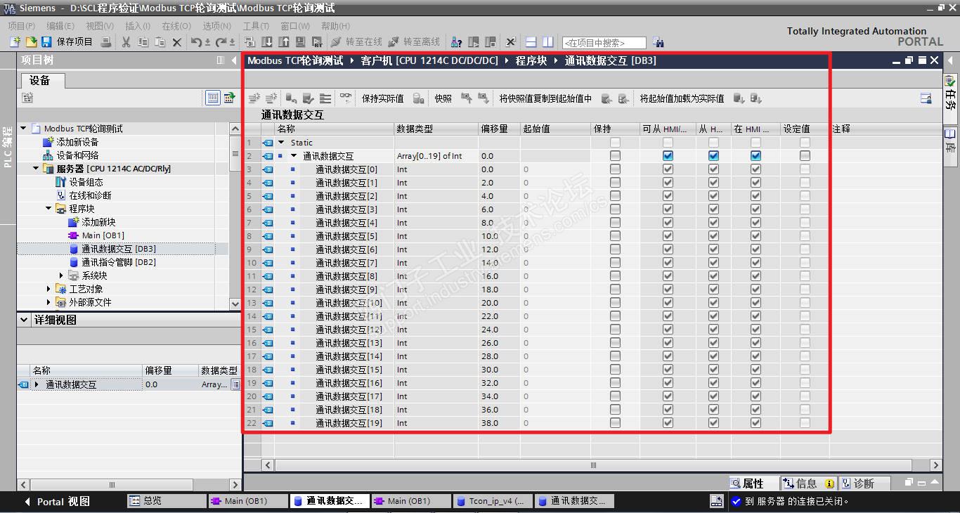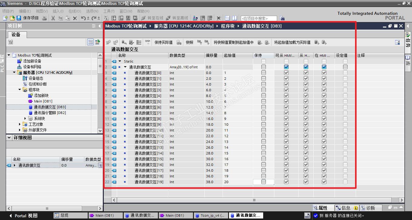 服务器:将数字1 ~ 20 分别写入DB3数据块的各变量中。