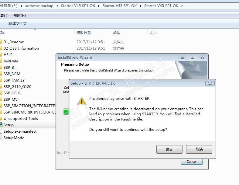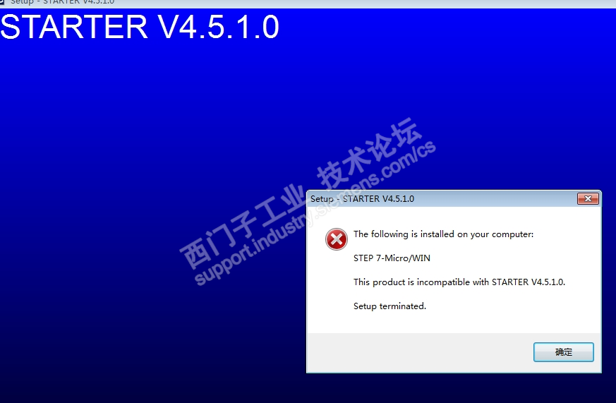 请教各位大侠,WIN 7 64 位系统 ,已安装有SIEMENS 的 S7200 和 S7300 软件,还有 WINCC FLEXIBLE 2008,博途软件 V14 和 V16 都正常运行,现在安装 Starter V45 SP1 软件报警无法继续请问有遇到的吗?