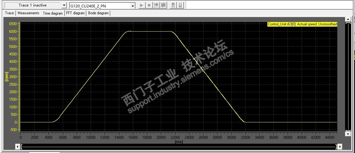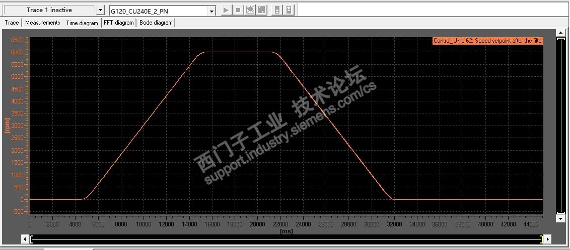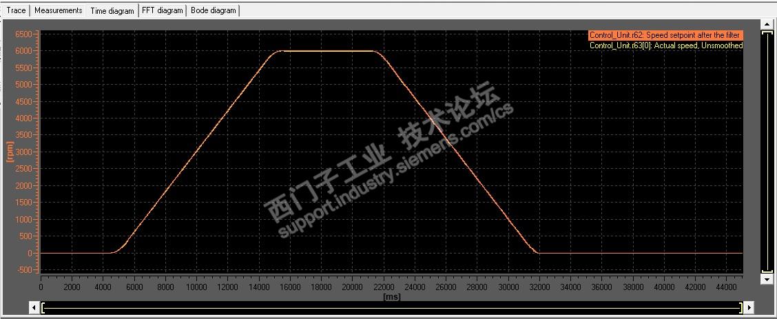 至此,完成了全部的参数设置。为了检验调试结果。用转速设定值r62与转速实际值r63录波确认。系统最高转速6000rpm,直接做加减速与匀速的波形曲线录制。结果如下: