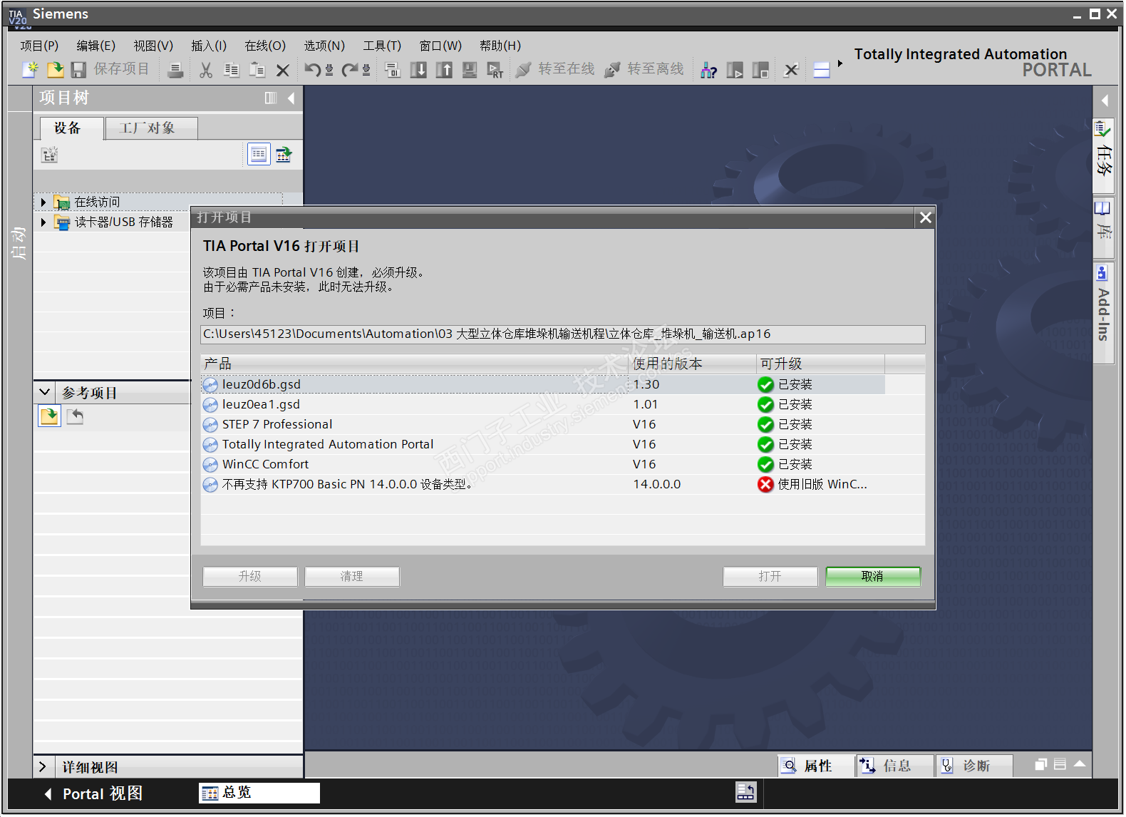 这是西门子 TIA Portal(博途)软件的界面,在尝试打开一个由 TIA Portal V16 创建的项目时出现提示 : 实体信息: 软件:Siemens Totally Integrated Automation Portal(TIA Portal ,博途),当前版本显示为 V20(界面左上角),要打开的项目由 TIA Portal V16 创建 。 项目路径:C:\Users\45123\Documents\Automation\03 大型立体仓库堆垛机输送机程序 \ 立体仓库_堆垛机_输送机.ap16 。 涉及产品及状态:列出 leuz0d6b.gsd(版本 1.30 ,已安装 )、leuz0ea1.gsd(版本 1.01 ,已安装 )、STEP 7 Professional(版本 V16 ,已安装 )、Totally Integrated Automation Portal(版本 V16 ,已安装 )、WinCC Comfort(版本 V16 ,已安装 );存在问题的是 “不再支持 KTP700 Basic PN 14.0.0.0 设备类型” ,对应状态为 “使用旧版 WinC...” ,因必需产品未安装,无法升级打开项目 。 简单说就是用 TIA Portal V20 打开 V16 项目时,因 KTP700 设备类型相关组件缺失,无法直接升级打开,需补充安装对应支持组件 。