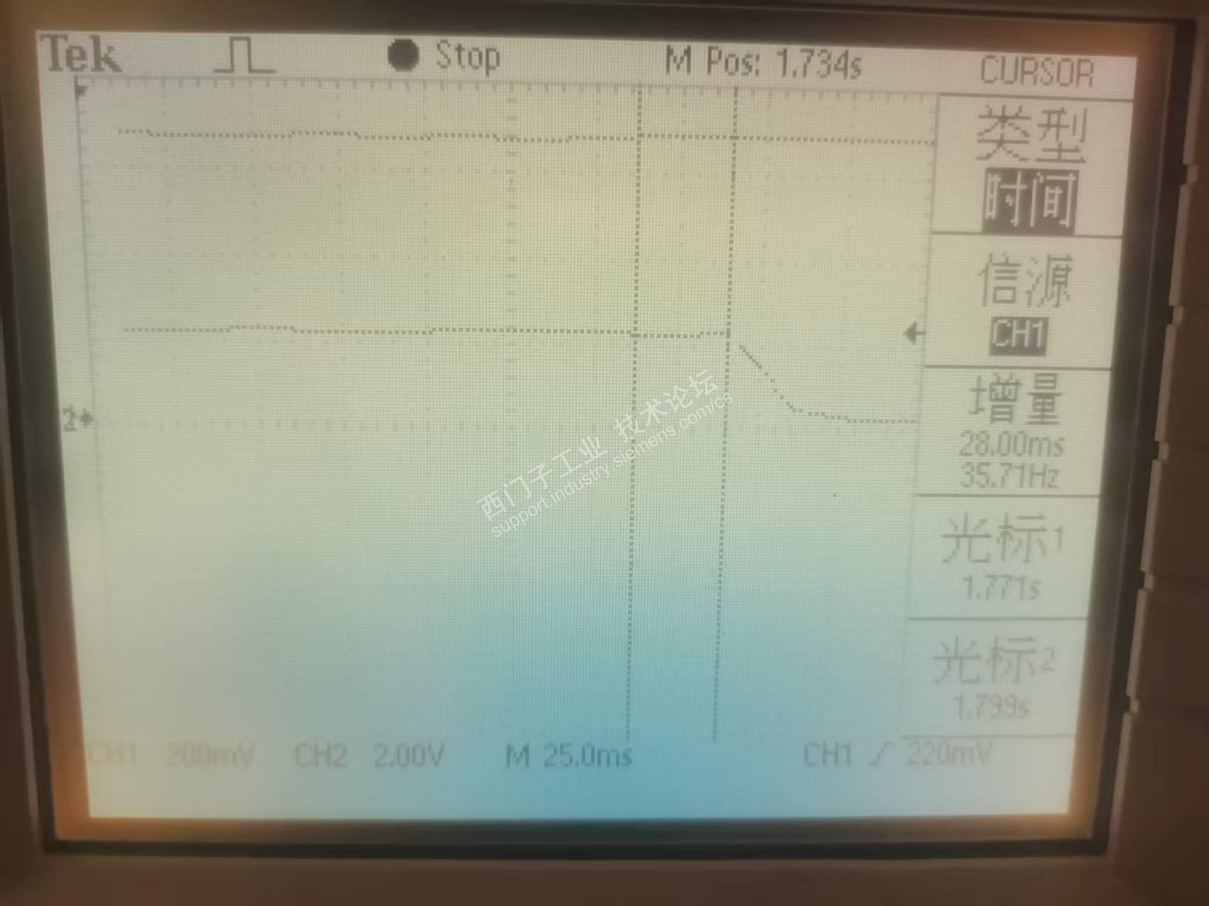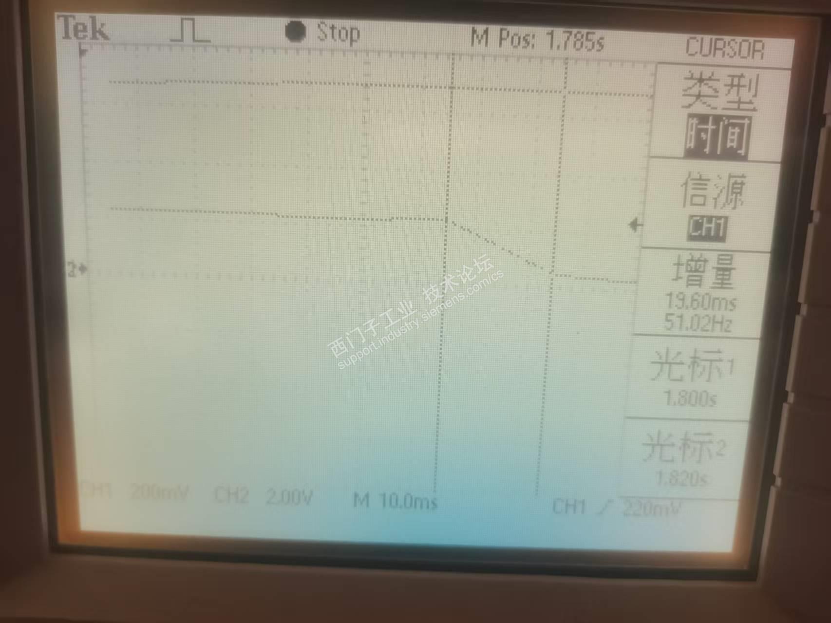 于是,删掉算数功能块,直接对斜坡函数发生器赋值,同样对电流输入值与AQ给定信号作了测试,经检测发现,去掉算数功能块,发现在输入电流超过设定值,发生过流保护时,LOGO!的反应时间为28ms,从作出反应至归零的时间(即斜坡函数发生器关断时间)为20ms,所以,在使用算数模块的情况下,过流保护的总时间约48ms。两者对比,减少的12ms即为加入算数功能块多出的反应时间。