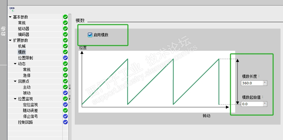 设备工艺是电机在旋转平台中心,回原点是不是不需要添加硬限位开关,只需要在平台上添加一个原点传感器就行了。 平台每旋转90度需要停一下,组态页面启用模数是不是也需要勾选
