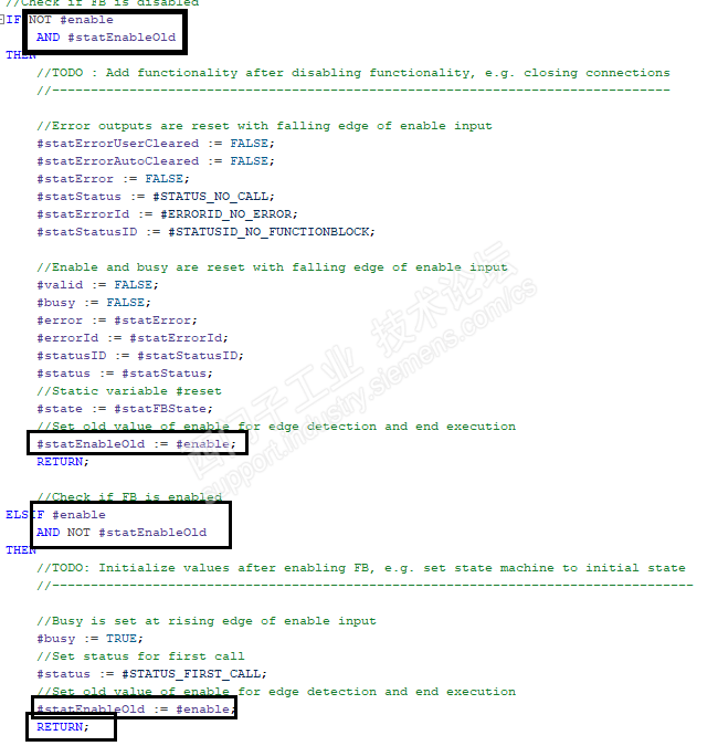 在这段程序中,enable和statenableOld使用的思路是什么,为什么使用RETURN指令,退出以后程序会怎样执行,是怎么样的执行顺序。