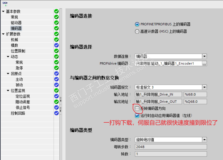 用1200工艺对象控制V90伺服,调试时发现伺服上下运动时位置和设计时相反,然后把工艺对象里面的反转编码器反向勾选了。
