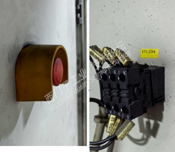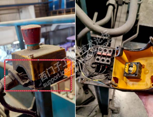 前一段时间,在运维过程中发现某设备顶部位置的一个急停按钮盒破损,需要更换确保设备的安全、稳定性,图示1: