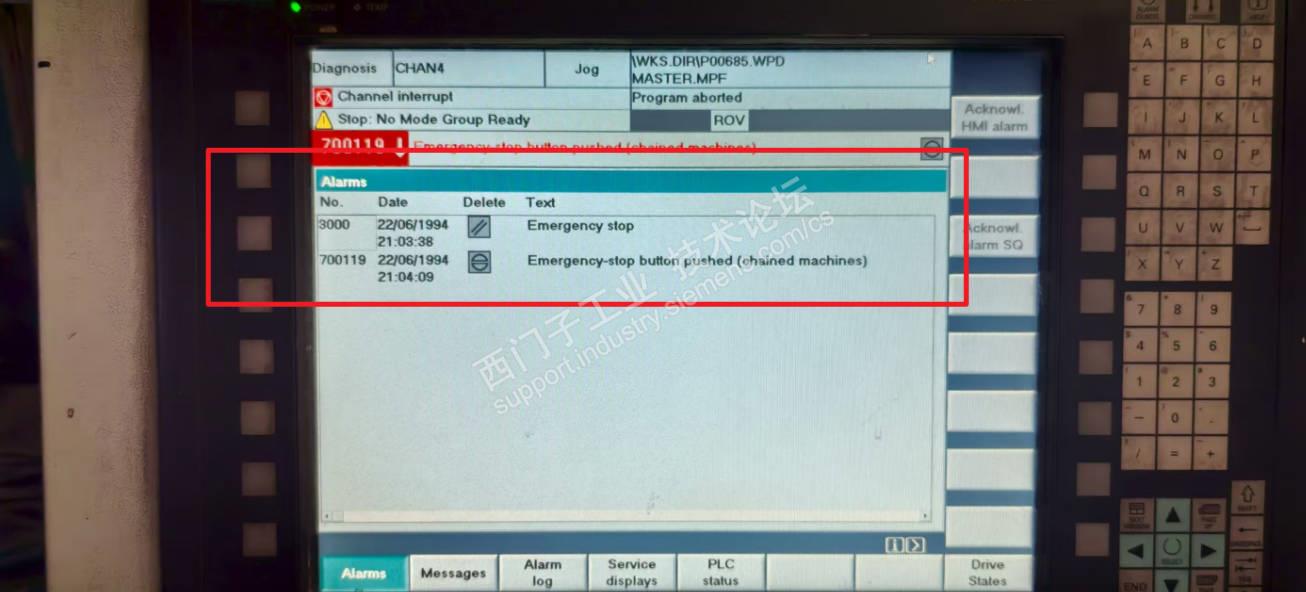 再次返回到操作台,看OP屏诊断信息,已经离去,没有了700119#报警信息,说明设备顶部的急停按钮盒工作趋于正常,更换急停按钮盒重新组合后的急停按钮盒,图示7: