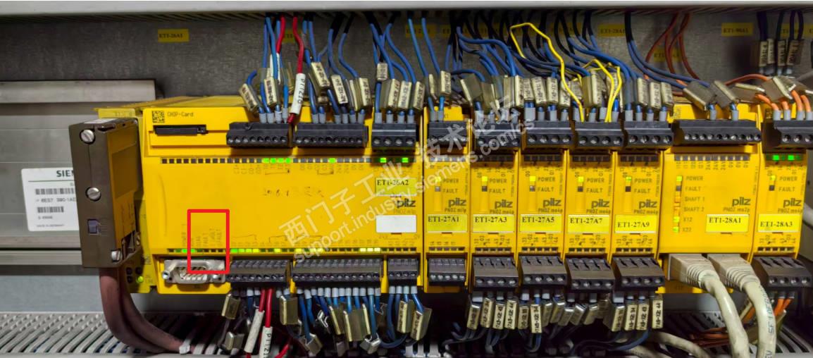 此时,比控制柜柜门更换触点时,要多出一个报警信息:700119#。这个应该是设备制造商自定义的报警信息,区别与系统3000#急停报警。在控制柜里面看到pilz确实有fault红灯报警,重启安全plc,fault红灯消除,说明在更换设备顶部的急停按钮时,安全plc被触发了报警,图示6:消除fault后的状态。