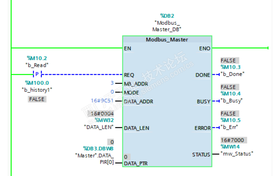 访问的区域长度大于数据块,或者所访问的区域对于要读取或写入的数据字节来说太小。”针对于图2,"Modbus_Master_DB"指令里面的DATA_LEN应该设置为多少?Master【DB3】数据类型应该如何设置?请帮忙检查"Modbus_Master_DB"指令是否存在问题?