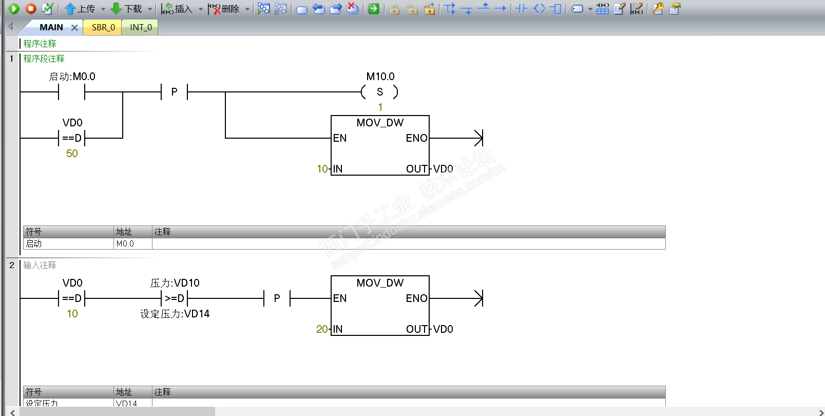 请教下大家,M10.0,M10.1是分别带的Q0.0和Q0.1,是俩个电磁阀,但是我发现程序运行后,2个阀都没有动作,VD0里的步走到50就不动了,然后我试着在现在的程序里每一步中间加个定时器延时200ms,程序就正常了,2个阀的动作也正常,请问是哪里出现问题呢