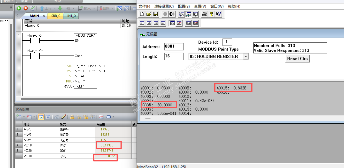 我现在想把PLC采集到的温湿度值输出成modbusTCP,我配置了一个TCP server,用软件也能读到值,我现在就是搞不明白这个寄存器地址怎么对应的呢 求教各位大神