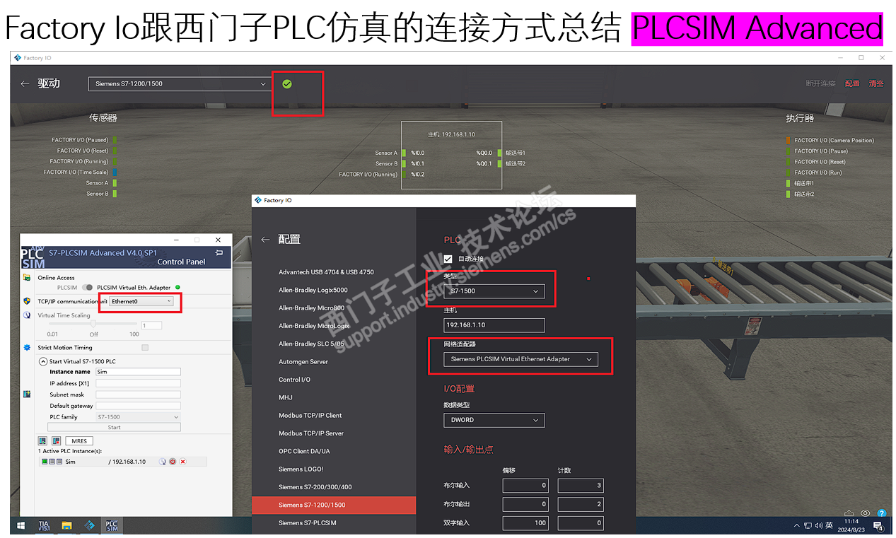 Factory IO 支持与西门子PLC通过以太网、PLCSIM、Modbus等方式通信,适配性强,便于集成到不同的自动化项目中。