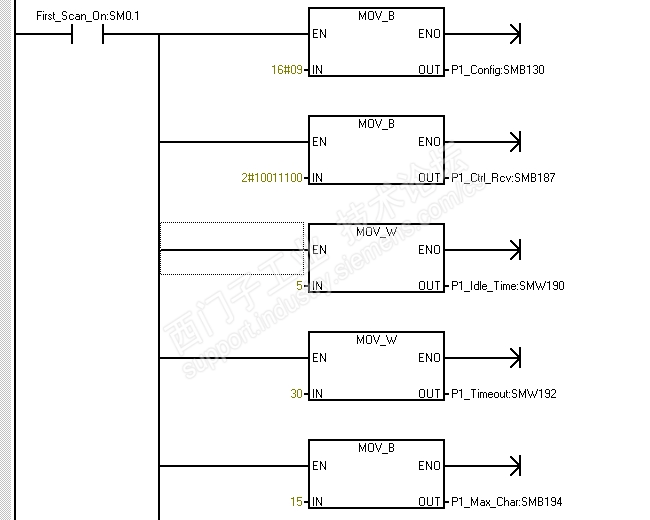 在发送完成中断程序中,增加一条开启接收信息控制字节指令(SMB87或者SMB187,我用的2#10011100) ,程序末端增加一个BGN-TIME指令,时间存入某个VD地址如VD402中,然后在主程序或者子程序中用CALL-TIME指令将VD402存入VD406,做比较,如果VD406大于等于100(ms),认为接收异常或者没有接收到信息,则关闭对应接收信息控制字节(SMB87或者SMB187,2#00011100) ,紧接着重新RCV一次,到中断中,会重新开启接收,如果正常接收,程序正常运行没有问题,如果有异常,则会关断并重启接收;