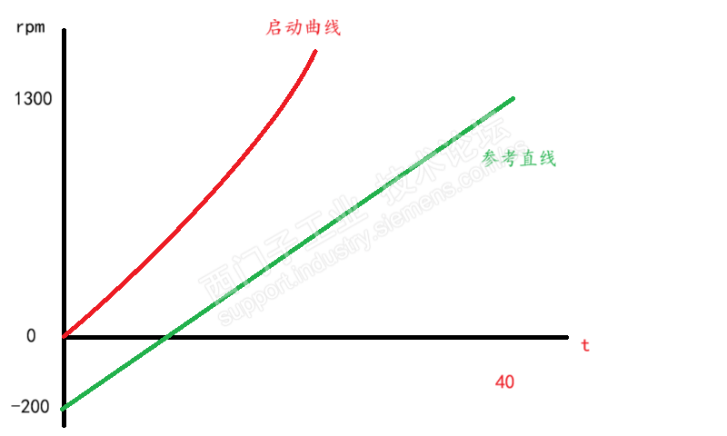 根据测试,在50赫兹下启动的转速的上升曲线是比较接近线性的。然后我用一条参考直线对上升曲线进行比较。整个启动过程一旦曲线低于参考直线,即立即报警停机。