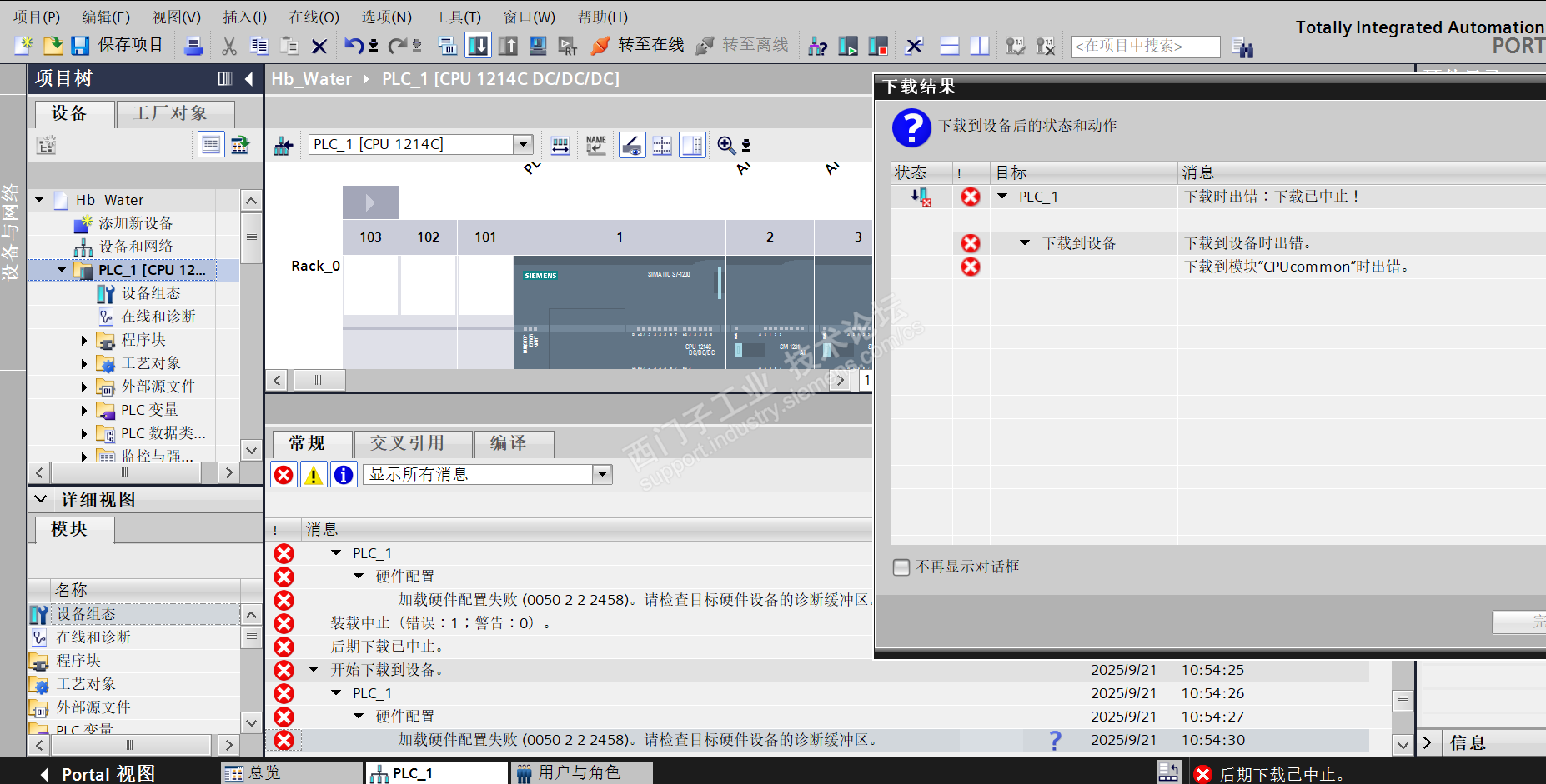 WIN10系统,安装了TIA V20,PLCSIMV20,创建一个新项目,选了1214C V4.7最新版本,写了点程序,用户创建了角色,不用没有报错,打算仿真试试,下载提示加载硬件配置失败 (0050 2 2 2458)。请检查目标硬件设备的诊断缓冲?请问怎么解决呢