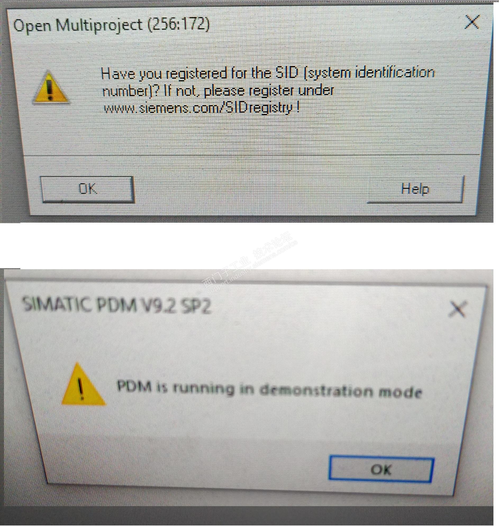 各位朋友们:我们工厂是西门子PCS7系统,每次在ES站点击SIMATIC Manager进入时,总是跳出System identification number这个画面;紧接着是这个PDM内容的提示;如附图所示我总是点击叉号把这两个都逐个关闭,有时候会关闭好几次。请问大侠们,这是咋回事?我不用管它吧,每次都把它们关闭就可以了吧?