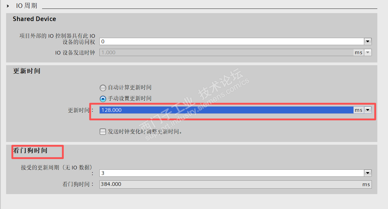 IO更新时间不要设置为自动,可根据需要设置为128ms、256ms等,看门狗时间超过设置的更新时间,就会掉站。