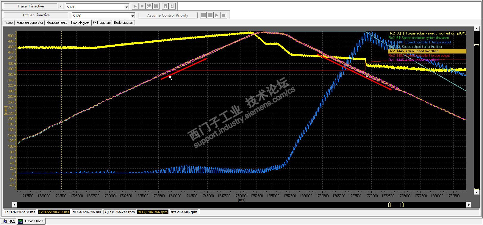 铝箔分切机,S120, ALM ,矢量轴,1PH8电机;放卷做速度轴控制,作为基速;收卷做速度环饱和力矩限幅控制,系统在升速和降速过程中,放卷实际速度等于给定速度且波动在正常范围内,收卷速度环未退饱和,实际转矩也等于给定转矩,但是收卷会速度在300-400rpm左右这段速度范围时出现很大速度波动,最大的有近10rpm,其他速度段正常;降速时经过400-3