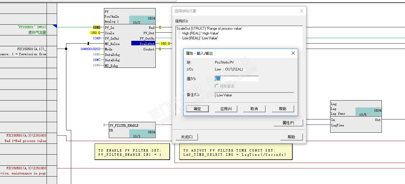 如果 Scale 管脚在线时的下限值不是 0 的话,那就在线直接修改。如果 只是 ScaleOut 管脚的下限值还是 6.3 的话,那也在线直接修改。如截图所示:双击 ScaleOut 管脚,会跳出一个对话框。然后再双击 Low Value 所在的行,再跳出一个修改值的对话框。修改后直接应用。这个时候 WinCC 画面上的值就应该正常了。