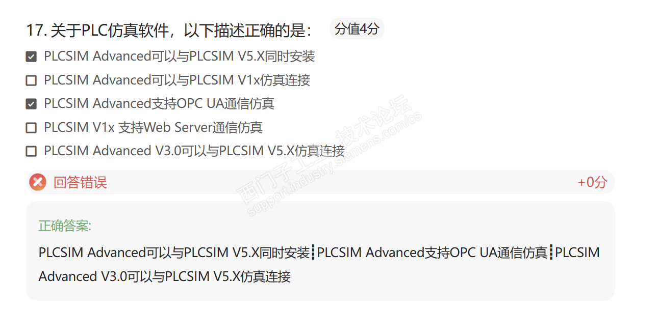 阶段二自测题中第17题,选项5, PLCSIM Advanced V3.0可以与PLCSIM V5.X仿真连接,这个选项的说法是正确的吗