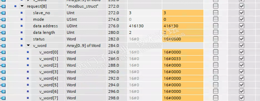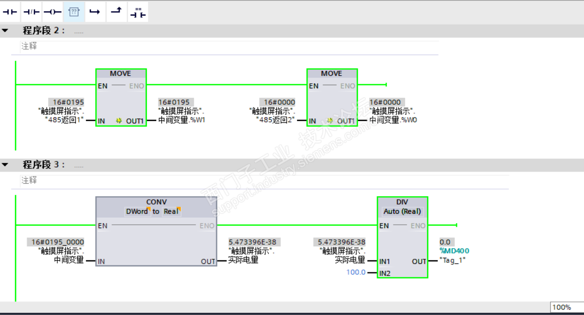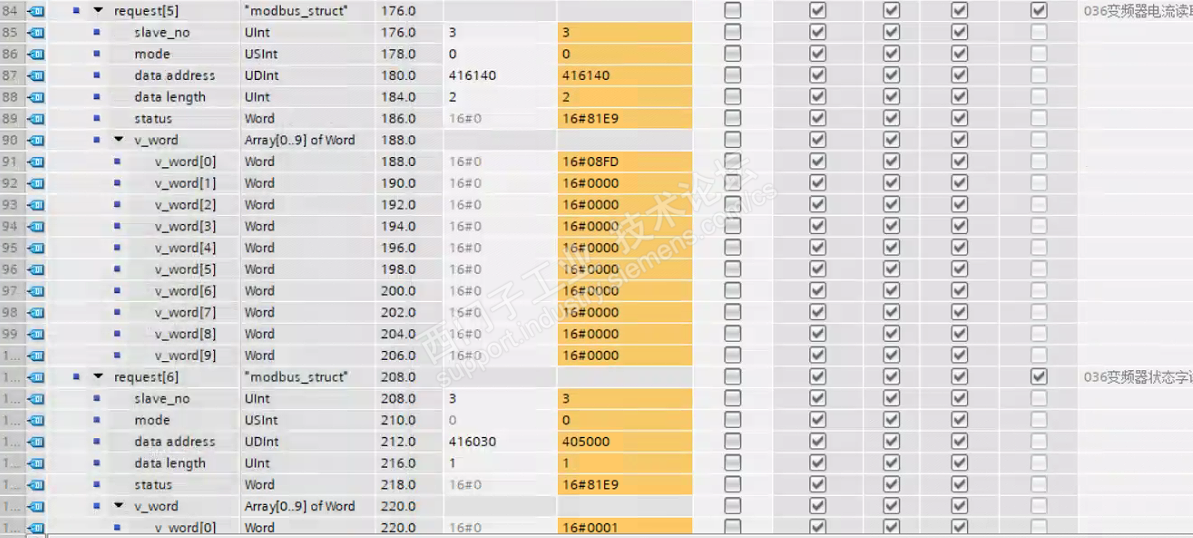 如图,与丹佛斯485通讯读取的电流值时,第一个字时16#0195,第二个字是16#0000,但是怎么也换算不好,16#0195换算成十进制是405,因为它精确到0.01,所以要除以100,得到4.05A。变频器面板显示也是4.05A,但是我不会换算DWORD,有哪个同行帮我换算一下的啊?还是说我这个高低位要互换一下呢,我换过了也还是不行。