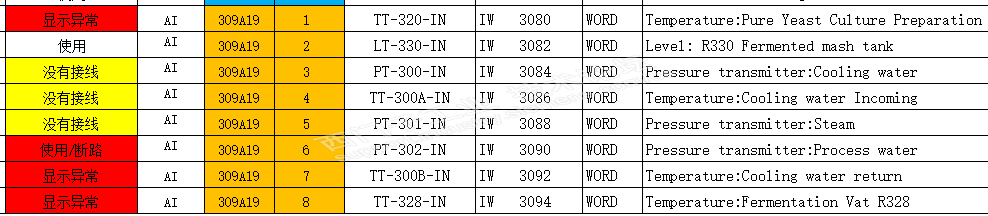 在接线柜上,这一部分线的位置比较高一些,我爬上去看了一下;刚才列表中标注的黑洞,是没有接线,程序组态了,在Wincc画面上显示黑色图标,我称之为黑洞。我核查了一下,有三个通道没有接线,重新更新一下列表情况。