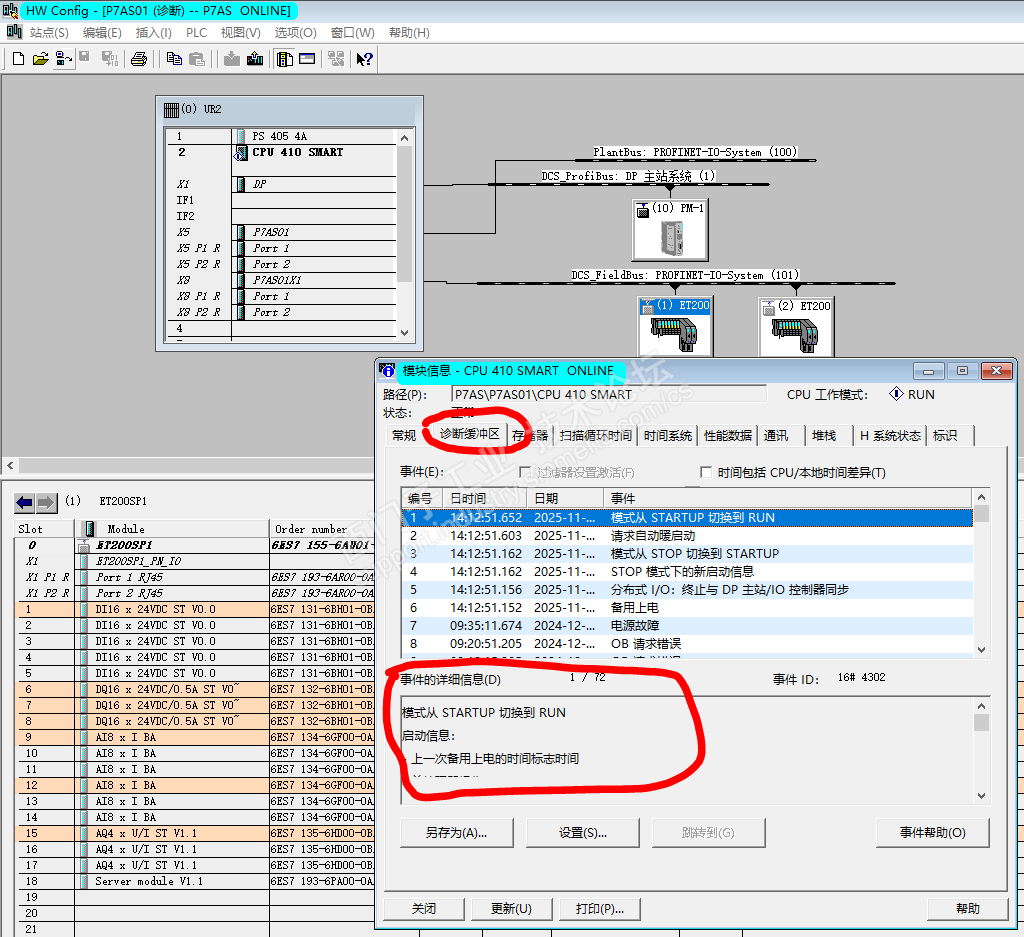 2. 双击 CPU,在诊断缓冲器页面,你可以看到每个事件的描述。找到跟 I/O 相关的事件,看具体的描述;
