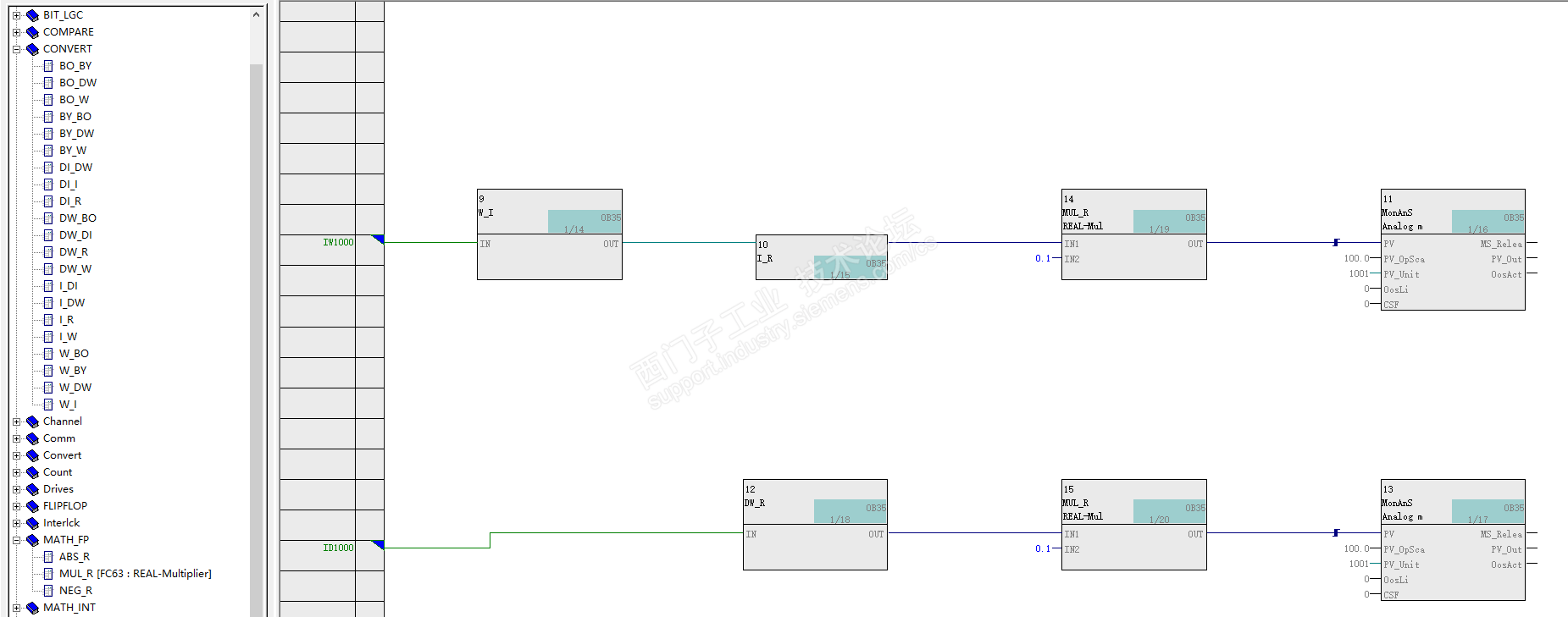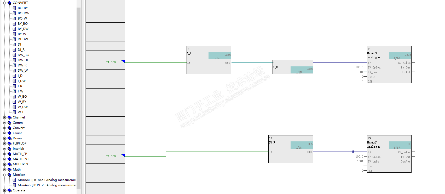 2. 当硬件组态中 DP 通讯设置的是 4 个字节来表示的,则用图中下面一行用的几个标准块:DW_R -> MonAnS 块。假设输入地址是 ID1000。MonAnS 块是用来在 WinCC 画面显示的标准块之一。你需要自己设置 显示单位 PV_Unit 和 量程 PV_OpScale。