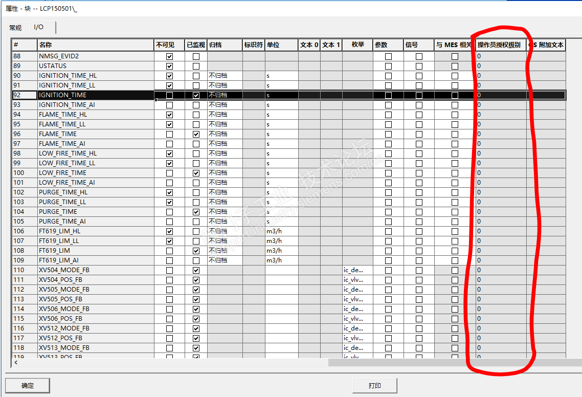 用 SFC Type 编辑出来的 EPH CFC 块,如截图所示。在 “操作员授权级别” 一列全部是灰色,默认全部是 0。也就是说,不可以修改,更不能根据不同的用户进行权限分配。