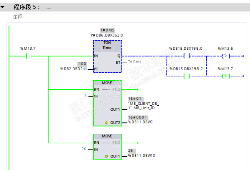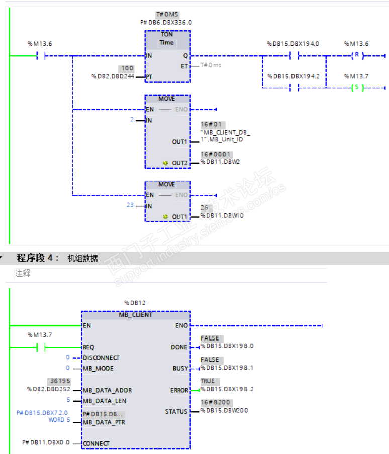 两个从站调用两个 MB_CLIENT,背景数据块使用同一个,ID 、 端口、数据地址长度等切换,