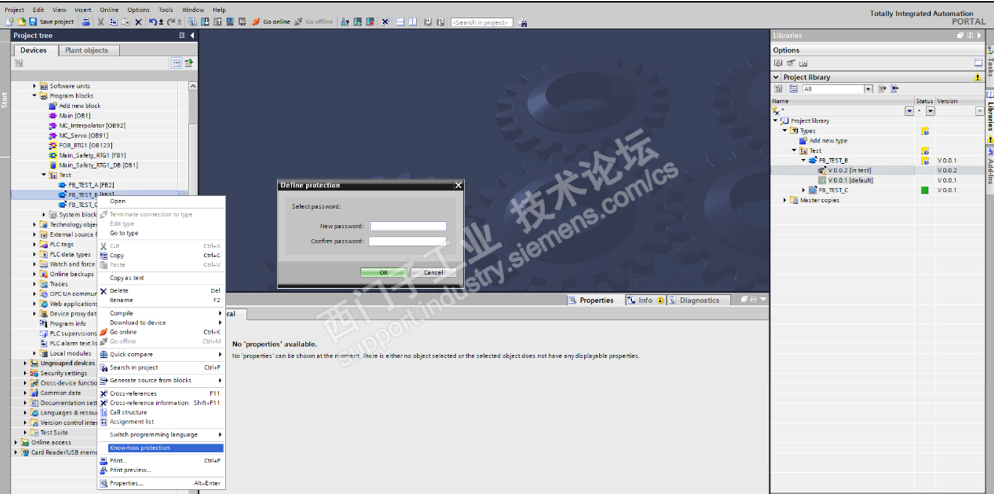 针对上述问题:既想要关联到库的连接,又想对功能块加密,怎么办?多次尝试发现:选择需要加密的功能块(可多选),右键”编辑类型”,若功能块打开,将其关闭,再在功能块上右击选择“专有技术保护”,弹窗内输入密码即可,如下图三所示。