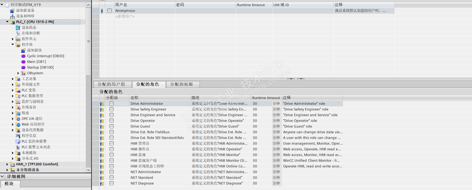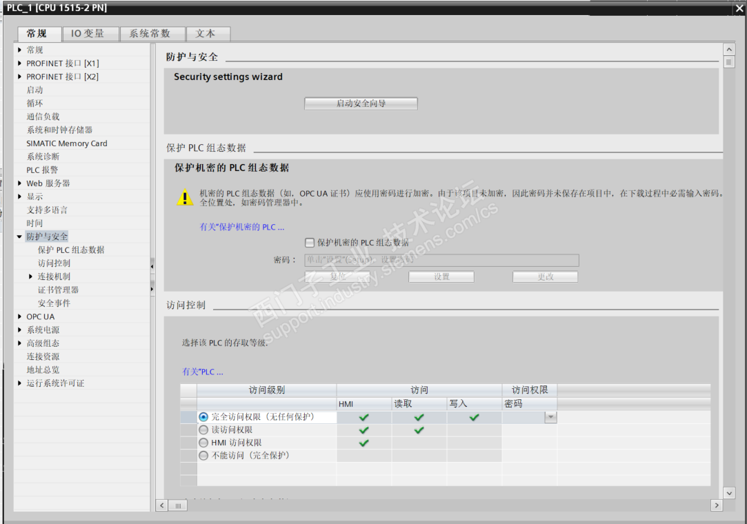 二、将原来V17 项目程序使用V19 打开,使用默认安全设置(没有设置全管理帐户),没有设置保护PLC组态数据功能,也没有设置访问控制限制;如下图