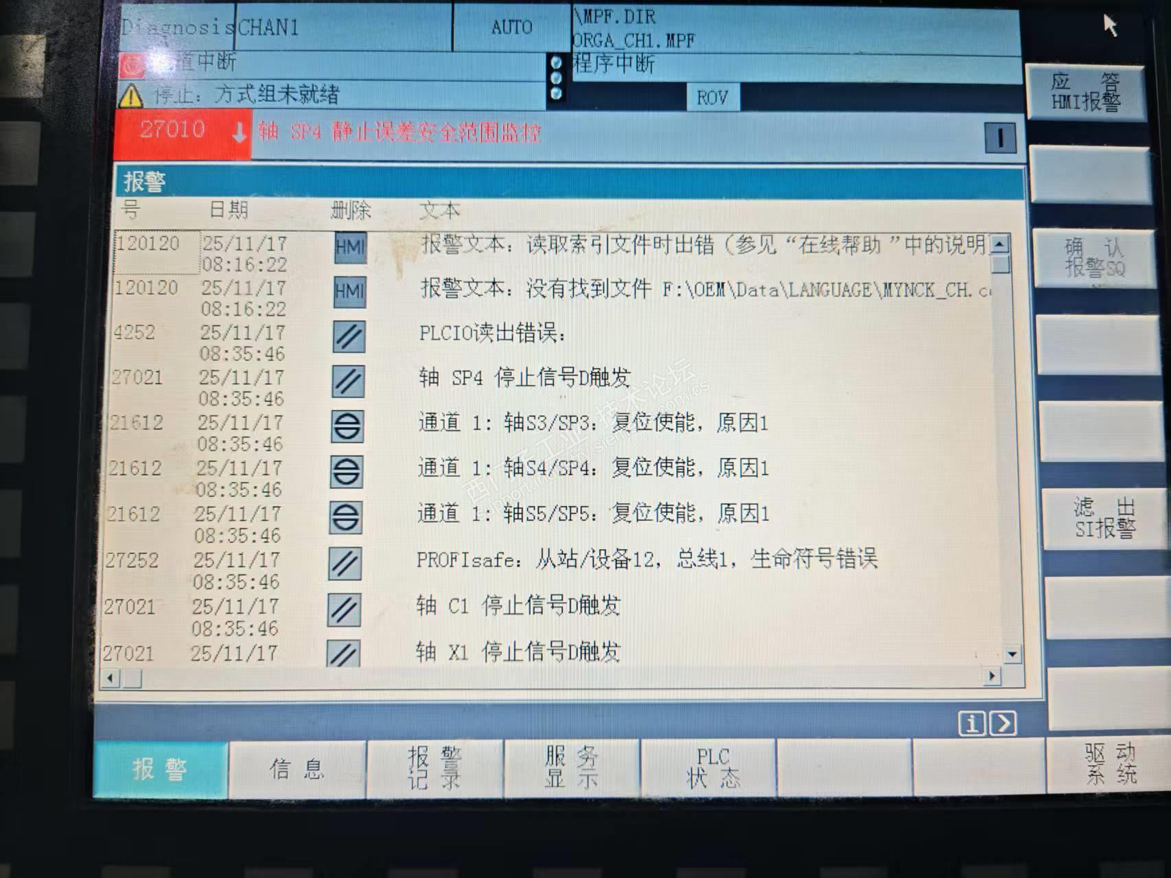 1、7月份加工过程中就出现该报警(主要为2个报警为:4252 PLCIO读出错误;27252PROFIsafe:从站/设备12,总线1,生命符号错误),但是偶发,间隔时间较长,可能1周出一次,目前从11月13日截止到24日,这个报警频发(在开启液压后待机时也会出现该报警),诊断用现场总成显示而且还会连续闪断恢复现象,KF05.3、KF05.4(6ES7138-4FB04-0AB0)两个输出模块没有输出。观察这个S7-300的输出模块闪断的时候可能会拉停,输出点子断了,指示灯不亮,2-3秒钟后恢复。