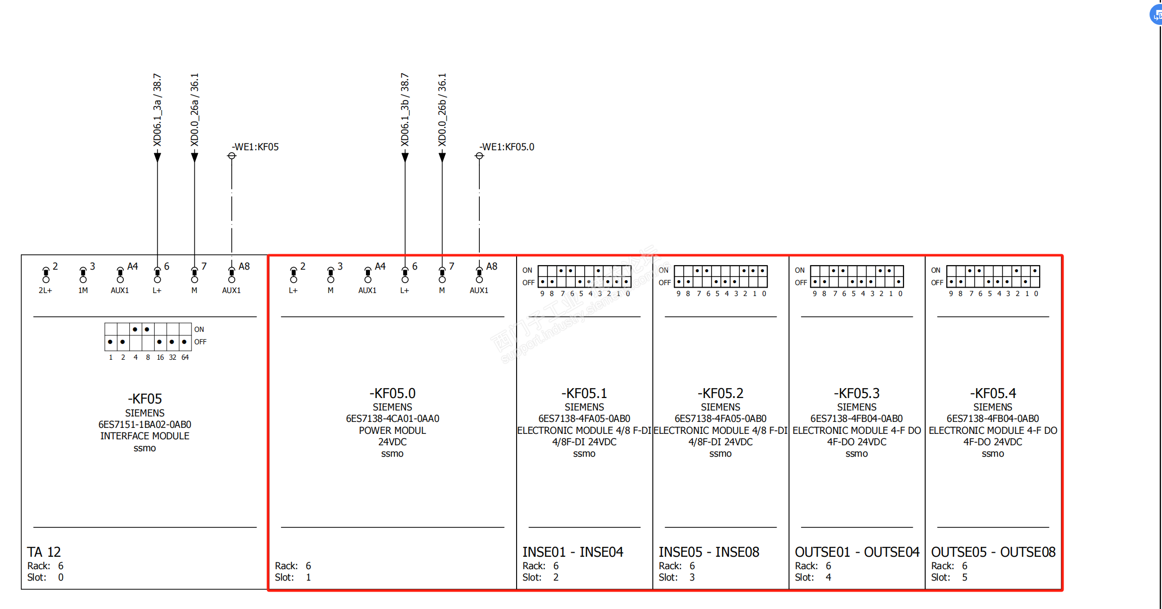4、闪断过程中KF05的输出模块无输出(指示灯熄灭),我们已经检查过程24V供电(疑点),同时对ET200M上的24V供电进行了检查,未发现电压突然拉低的情况。